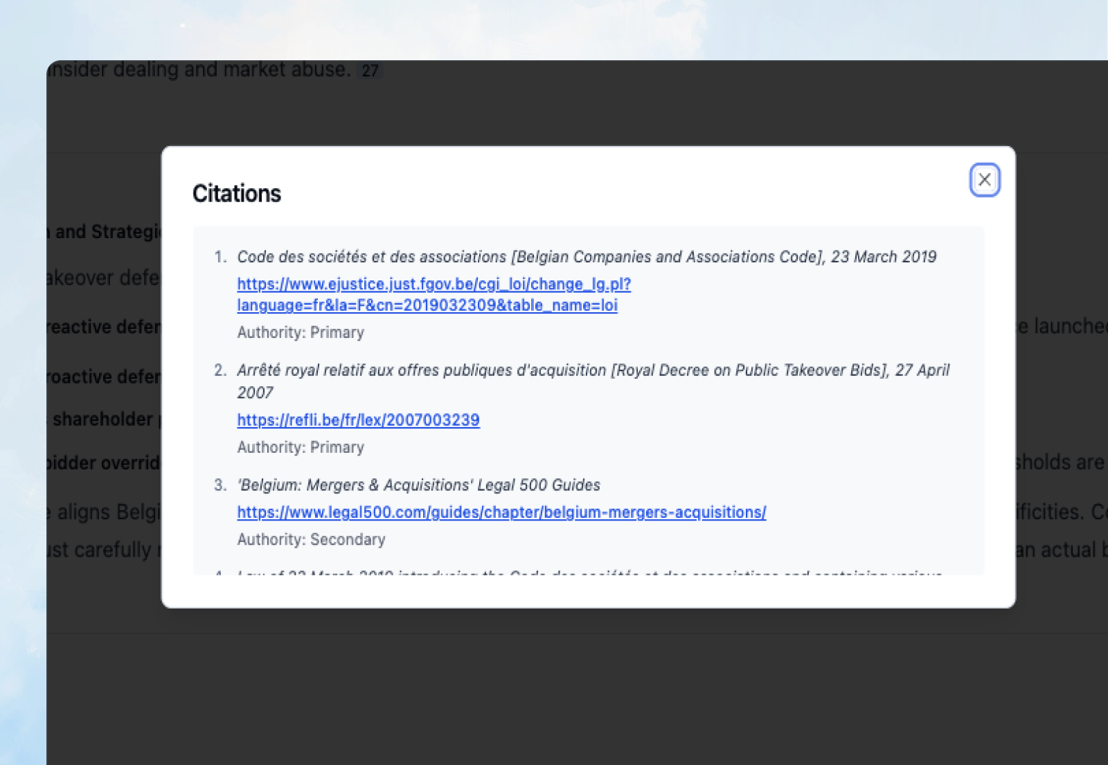 Web sources: Click the citation link to access the original source directly on the web. This takes you to the legislation database, court website, or official publication where the Assistant found the information.